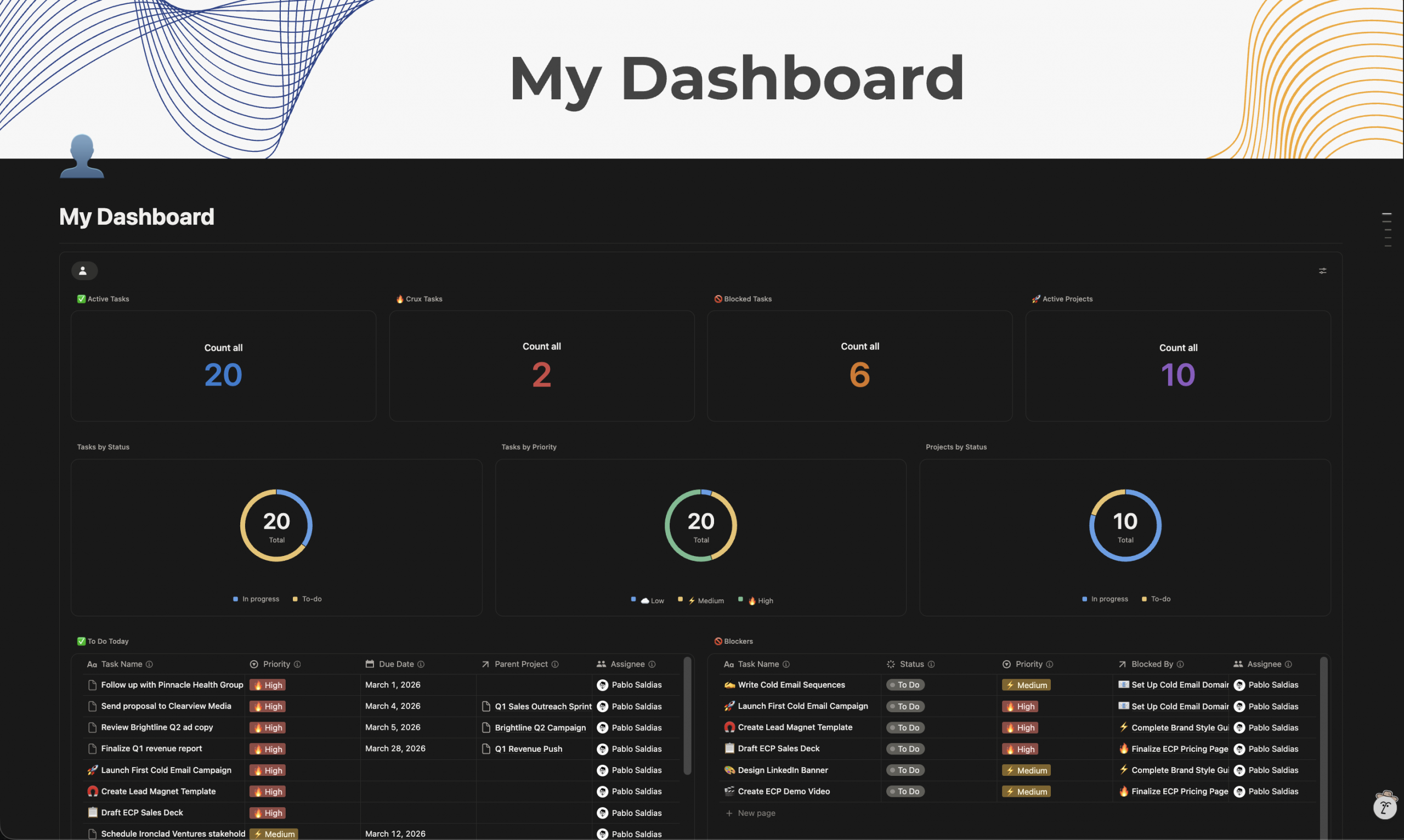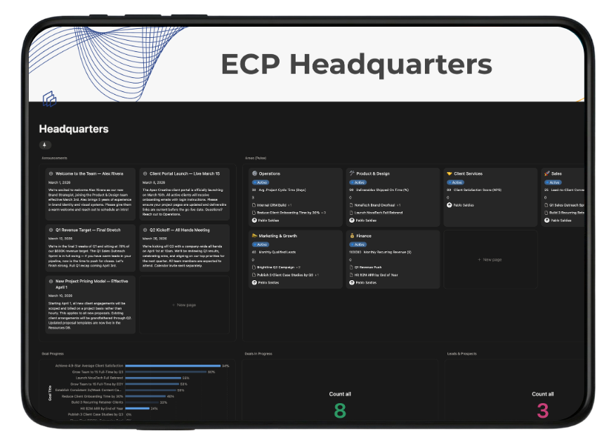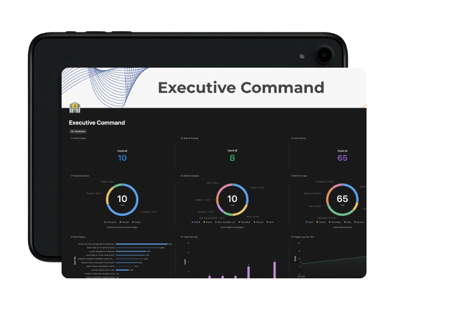 We deploy the Executive Command Protocol (ECP) — A proven operational system built on Notion that consolidates your entire operation into one executive command center. Not a template. A battle-tested framework, custom-configured to your team and your growth trajectory.